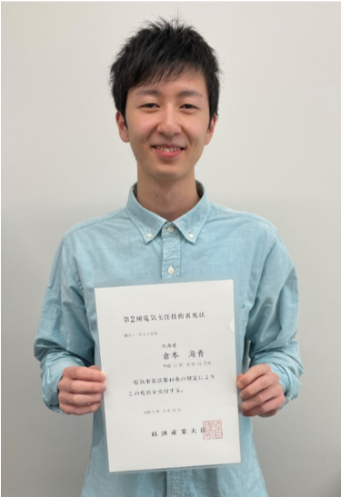 電気電子工学科の倉本 海青さん(学部4年生)が,昨年11月に行われた第二種電気主任技術者試験に合格しました。倉本さんは,同年9月に行われた第三種電気主任技術者試験にも合格しており,今年2月に本学の優秀学生賞を受賞しています。(https://www.hus.ac.jp/hit_topics/2021/02/202102094408.html)