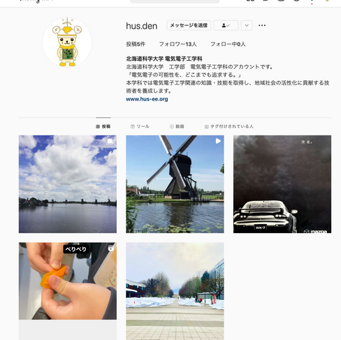 2022/03/24 学科公式インスタグラムを始めました!管理人2022年3月26日読了時間: 1分電気電子工学科では,今まで以上に電気電子工学の魅力,学科の取り組み,学生や教員の素顔を伝えるため,これまでのウェブサイトやブログ,フェイスブック,ツイッター,ユーチューブに加えて,インスタグラムを始めました!インスタ独自の企画も行う予定これまでのSNSとは異なるセンスで情報発信していきます. 是非フォローをお願いします!→ https://www.instagram.com/hus.den/