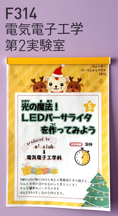 今年のウィンターワークショップデイ2025でもe2 club & 電気電子工学科主催の電子工作会を実施しました。その名も「光の魔法!LEDバーサライタを作ってみよう」です。