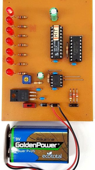 今回、オリジナルで開発したバーサライタは、必要な機能を持っていて一番安価(190円)に購入できたPICデバイス、PIC16F687-I/Pマイクロコントローラを使い、7個のLEDとオリジナルの表示データを書き込むことができるようにするためのロータリー・スイッチやタクト・スイッチを約50mm×80mmのプリント基板に収めたものになっています。