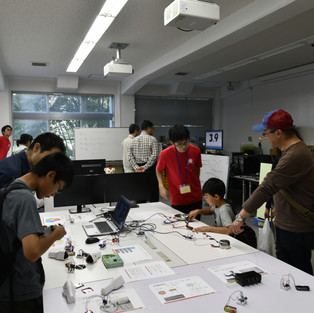 今回はさらに,子供や教員向け電子工作・プログラミング講座などに取り組んでいらっしゃる佐々木 束氏らが,自作の工作物を持参で会場を訪れてくださいました。来場の子供たちやスタッフ学生たちも遊ばせて頂き大変参考に,刺激になりました。ありがとうございました。